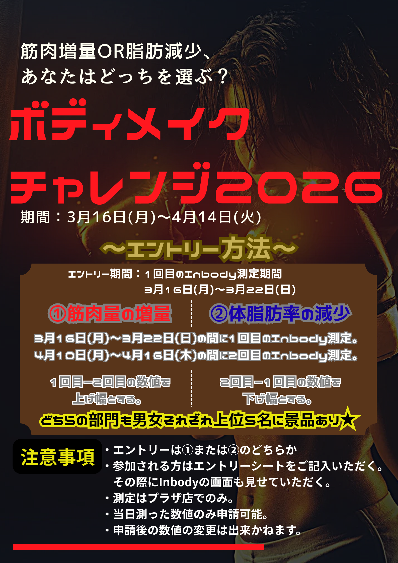 エントリーをご希望の方は、フロントまでお申し付けください。(エントリー期間:1回目のInbody測定期間)